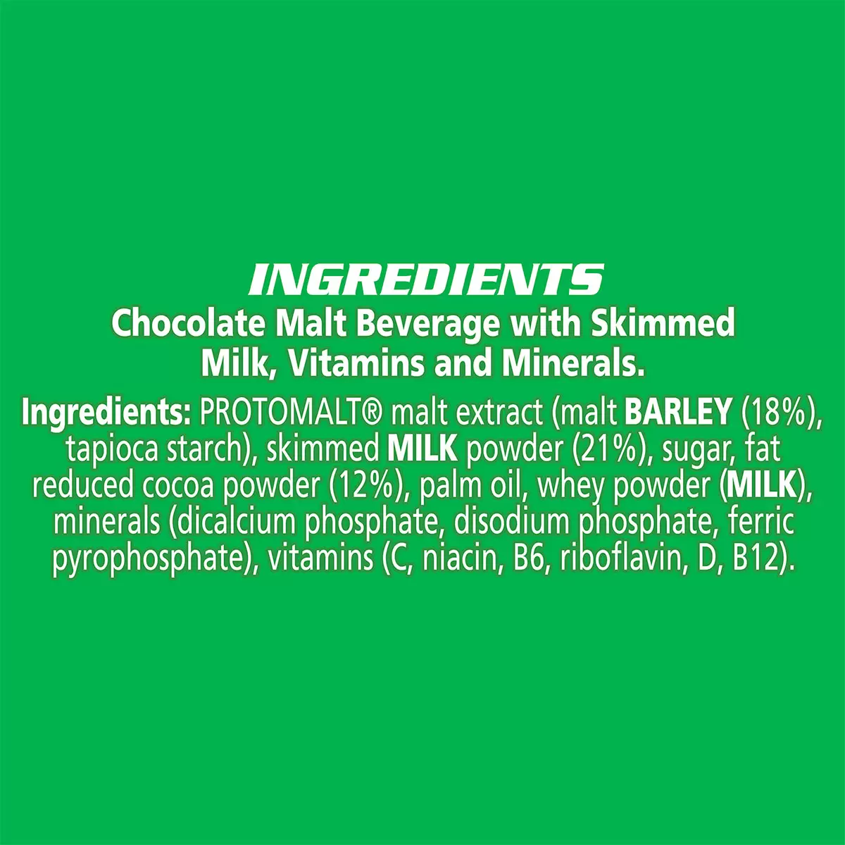 Nestle Milo Malted Milk is made from Protomalt™ malt extract, milk and cocoa with added vitamins and minerals. This drink is fortified with Vitamin D, C, B6, B12, Riboflavin, Niacin, Phosphorus and Iron. Calcium and Vitamin D are needed for normal bone growth and development in children. Vitamins B6, B12 and Iron contribute to normal energy metabolism and contribute to the reduction of tiredness and fatigue and Iron helps transport oxygen in the body. Simply mix with 180ml of hot water and enjoy this Singaporean malt chocolate drinking powder as part of a nutritious breakfast for the whole family to help provide you with the nutrients you need.